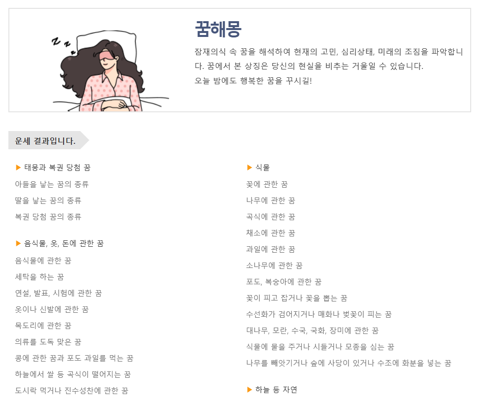 최근 본 꿈이 뭔가 의미가 있는 것 같다면 ‘꿈해몽’ 메뉴도 활용해볼 수 있습니다. 상징적인 소재(예: 뱀, 물, 불, 아이 등)를 키워드로 검색하면 그 의미를 쉽게 확인할 수 있어요.